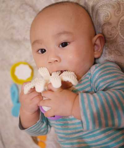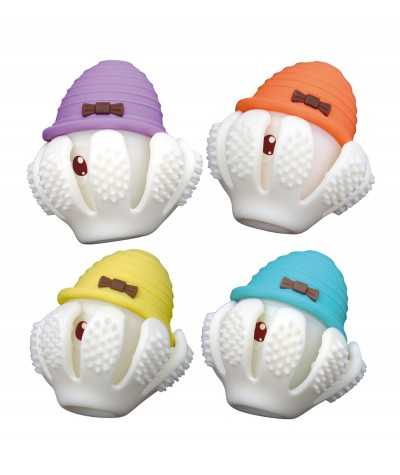 Uroczy silikonowy gryzak w kształcie ośmiornicy, sprężysty i elastyczny, łatwy do chwytania. Stymuluje i koi dziąsła podczas wyżynania się ząbków. Jest to również pierwsza szczoteczka z 8 masującymi odnogami.